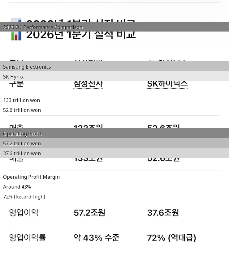 This is trending because SK Hynix's Q1 2026 operating profit margin of 72% is unprecedented and significantly higher than even tech giant Samsung's 43%, sparking discussions about the booming semiconductor market and its impact on major Korean corporations.