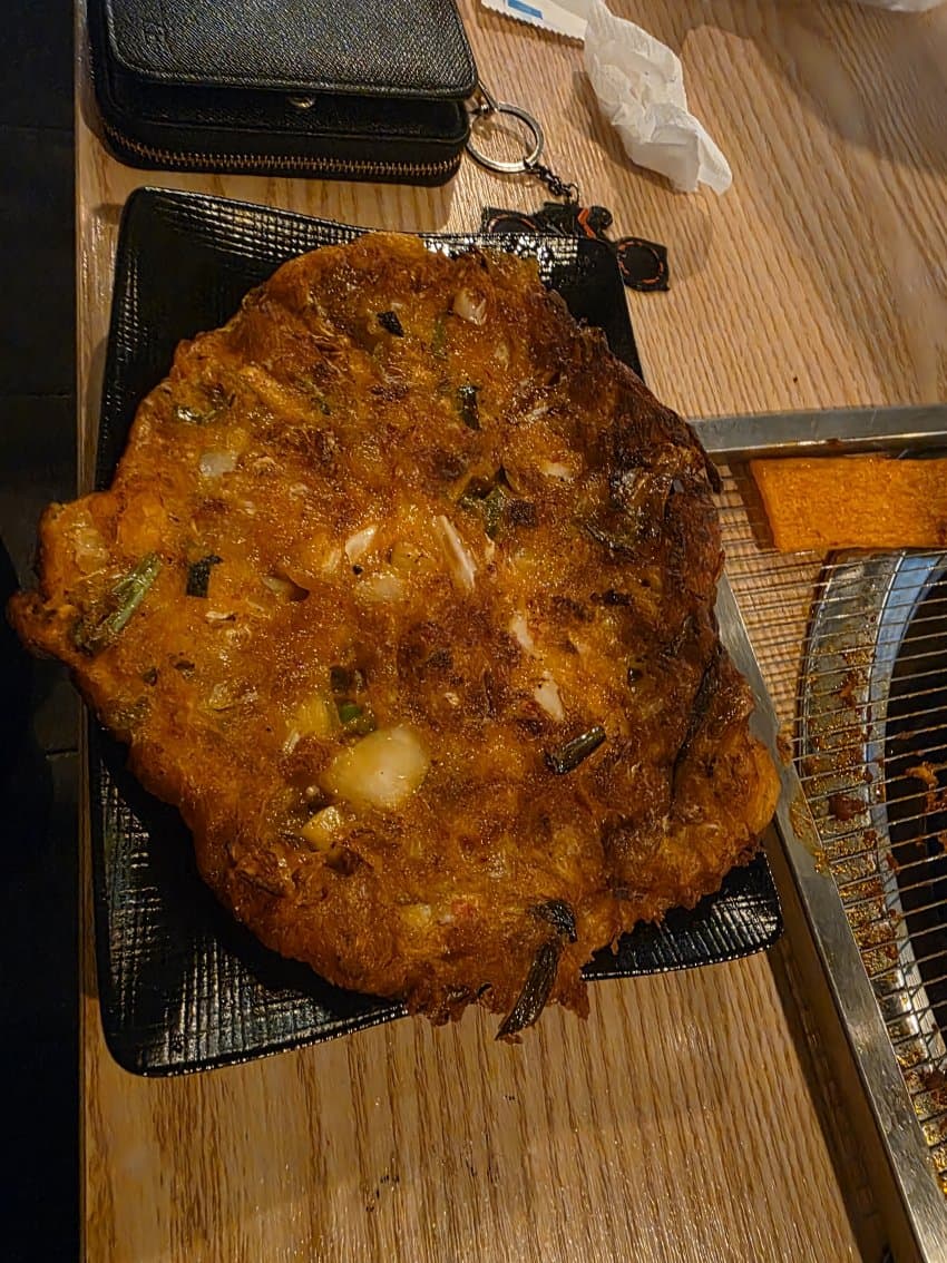 A popular savory Korean pancake made primarily with kimchi, flour, and sometimes other vegetables or meat, often enjoyed as a snack or side dish.