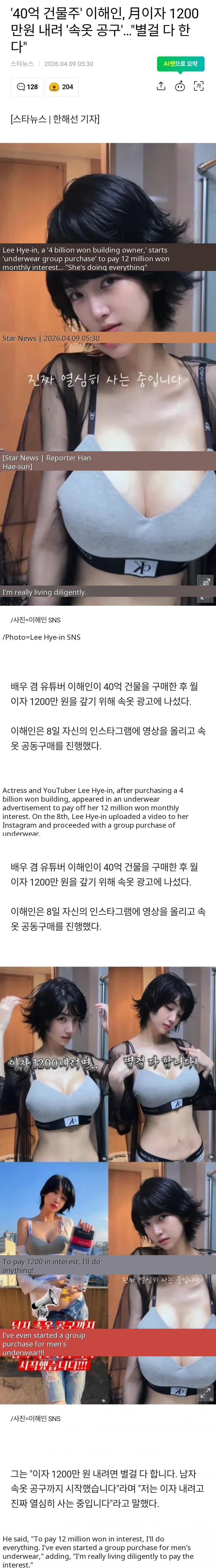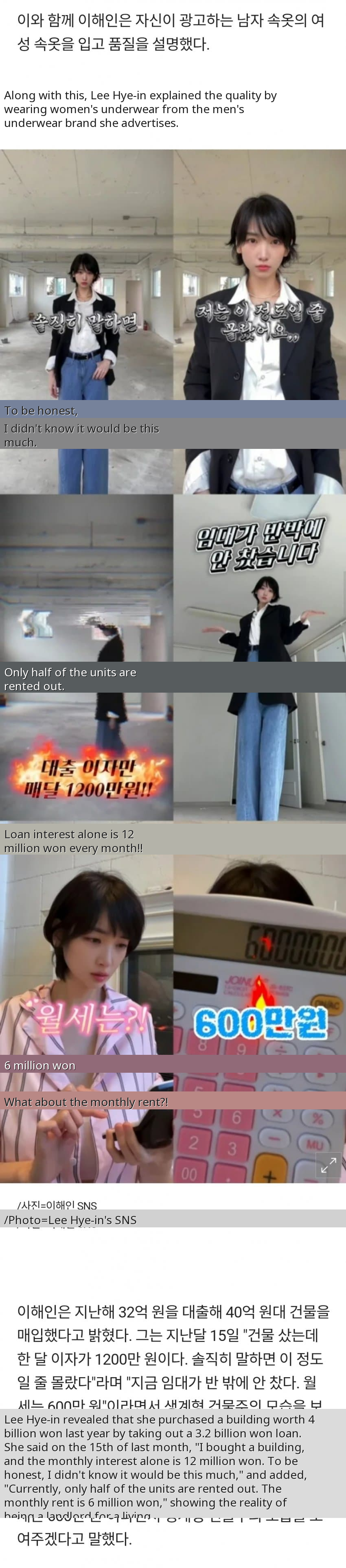 Actress and YouTuber Lee Hae-in is making headlines in Korea for her incredibly candid approach to managing a massive debt. After purchasing a building for 4 billion Korean Won (approximately $3 million USD) with a hefty 3.2 billion Won loan, she's now facing a staggering 12 million Won (around $9,000 USD) in monthly interest payments. The catch? Her current rental income is only 6 million Won, leaving a significant gap. To tackle this, Lee Hae-in has taken to Instagram, not just promoting products, but actively participating in a 'group buy' (공구) for men's underwear – even modeling women's underwear herself to vouch for the quality! Her viral posts show her openly discussing the financial pressure, stating, 'I'm doing everything I can to pay this 12 million Won interest!' This raw honesty from a celebrity, who many might assume would be a comfortable 'building owner' (건물주), has resonated deeply with many Koreans grappling with rising living costs and real estate woes.