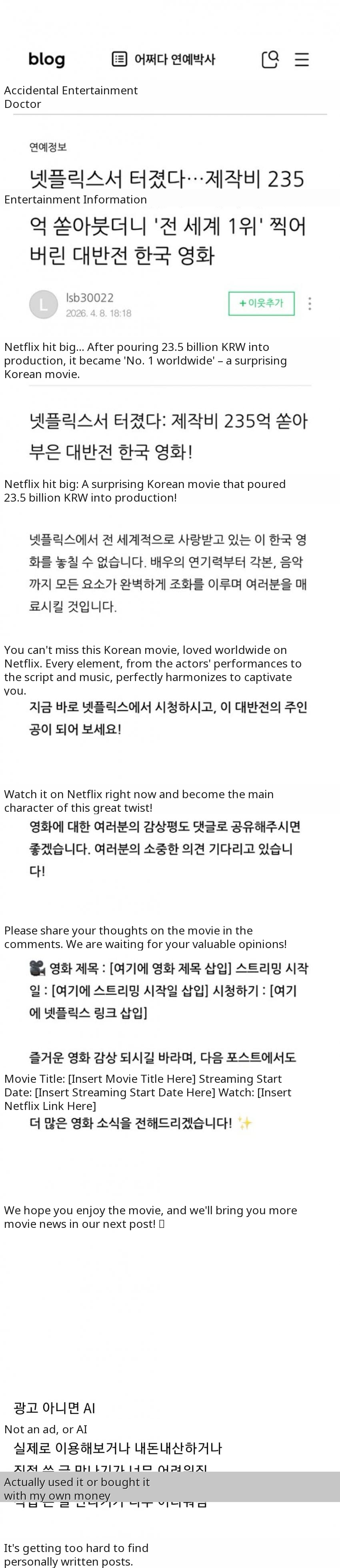 A recent viral post on Korean online communities perfectly captures the growing frustration many users feel towards Naver blogs, Korea's long-standing dominant portal. The core issue? It's becoming nearly impossible to find genuine, user-generated content amidst a deluge of AI-generated articles, blatant advertisements, and thinly veiled sponsored posts. Users are lamenting the lack of 'μλ§Ήμ΄' (substance), pointing to clickbait titles like 'Netflix Hit! 23.5 Billion Won Korean Movie Ranks #1 Worldwide!' that promise a big reveal but deliver generic fluff, often with placeholders for actual movie titles.