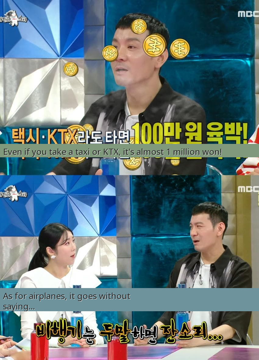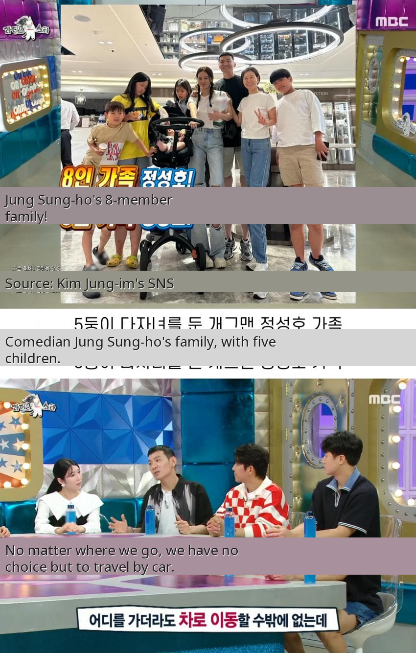Korean comedian Jung Sung-ho, famous for his hilarious impersonations, is making headlines not for his jokes but for his incredibly large family! With a wife and five children, his household totals eight people, a truly rare sight in Korea's low-birthrate society. Recently, on the popular MBC talk show 'Radio Star,' Jung Sung-ho's wife, Kim Jung-im, shared a glimpse into their daily life, revealing the jaw-dropping expenses involved in simply getting around. She explained that traveling anywhere as an eight-person unit is a logistical and financial nightmare. Even a simple trip by taxi or Korea's high-speed train, the KTX, can quickly rack up costs nearing 1 million won (approximately $750 USD) for a single round trip! As for flying? That's practically a pipe dream for the Jung family, highlighting the immense challenges and costs of raising such a big family in modern Korea.
