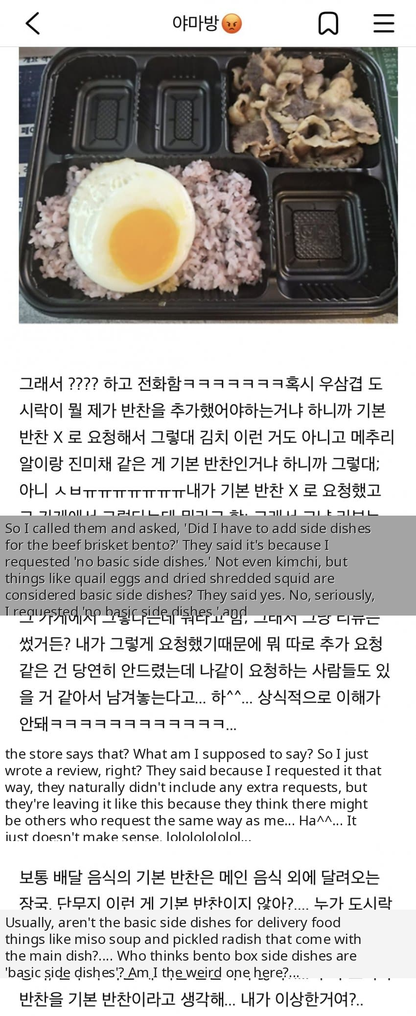 Okay, so this person on 야갤 was just trying to get their dosirak delivered, right? But they decided to be ~different~ and asked for 'no basic side dishes.' Like, maybe they just wanted the main dish, or they had their own banchan at home, who knows. But bestie, the restaurant *understood the assignment* a little too well. They literally sent a dosirak with just the main course, and the side dish compartments were just... empty. I'm screaming. The way the main dish is just chilling there, all alone, is sending me. This is peak Korean delivery culture chaos, no cap.