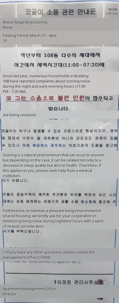A recent official notice from an apartment management office in Korea has gone viral, sparking a heated debate online about the limits of neighborly etiquette and privacy in shared living spaces. The notice, issued by the **management office** of a specific **apartment** building, addressed persistent complaints about loud snoring noises.
