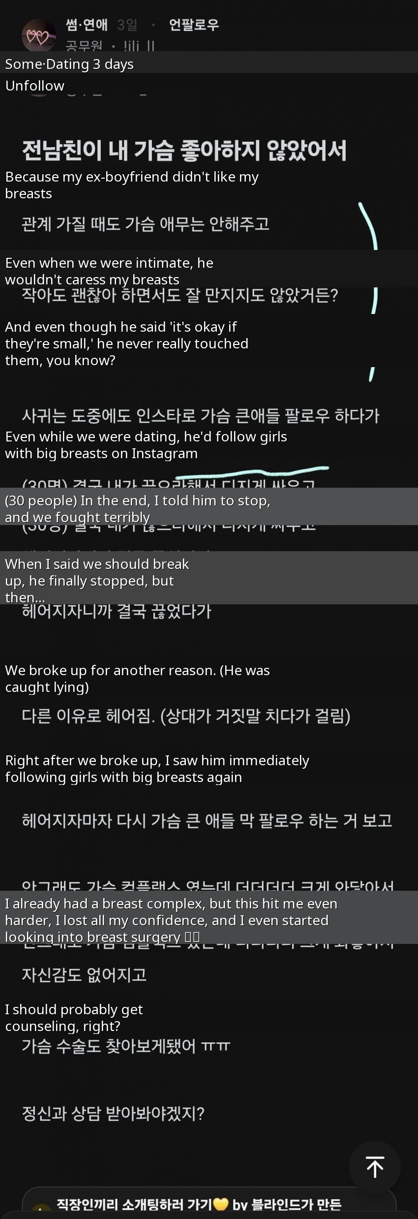 Commenters are having a field day, with some sarcastically 'recommending' the surgery, while others are comparing the drastic idea to the simple, cheap comfort of a Costco hotdog set. The 쓰니 even added to the humor with a self-deprecating comment, wondering why breasts even exist when they don't have any themselves, implying a broader struggle with body image. The post has ignited a debate on whether such extreme measures are ever justified due to an ex's comments, or if it's just a hilarious, albeit concerning, cry for attention. Many are already joking about what the 쓰니's *next* boyfriend might complain about!