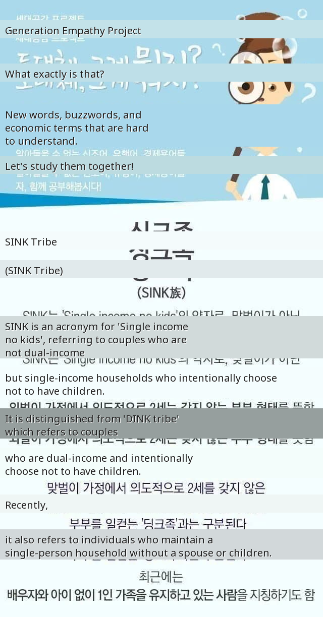 An acronym for 'Single Income, No Kids,' referring to couples where one spouse works and they intentionally choose not to have children. The '족' (jok) means 'tribe' or 'group.'