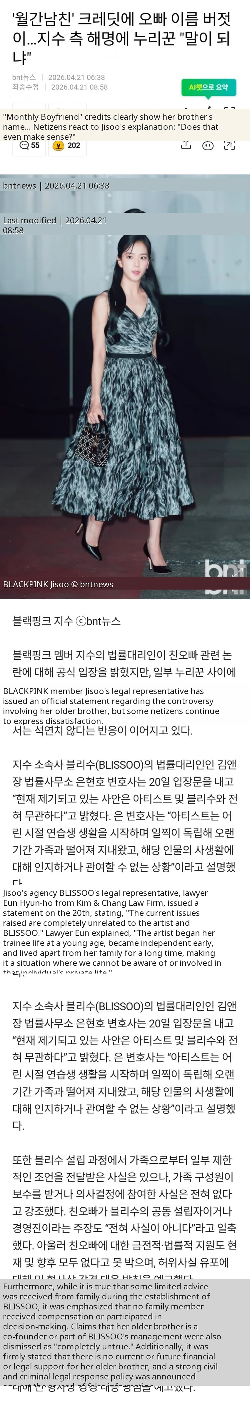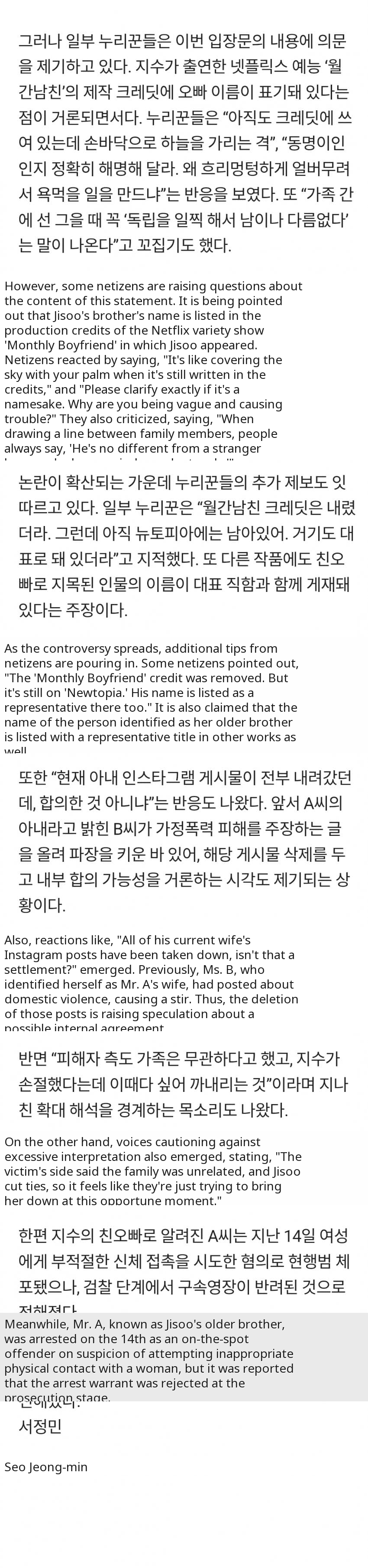 - 관련게시물 :블랙핑크 지수 측 김앤장 선임 "민·형사상 모든 법적 조치 취할 것-지수 오빠가 팬미팅 크레딧에도 올라가 있었네월간남친 크레딧 뿐만 아니라..소속사 직원 면접도 보고 미팅도 다니고 팬미팅 크레딧에 올라있음.블라인드 사건 이전이라고 해도 오랜기간 가족과 떨어져 지냈다는 입장문과는 너무 차이가 나는데..뭘하고 다닌건지 더 터질게 있다는 말들이 나오고 있다고 함.글고 경찰이 쳐들어간 아파트가 강남 4-50평대 아파트라는데 이진호는 취재결과 오빠가 유산균 대리점으로 번돈이라는데본 사람들은 30대 철없는 소년같이 보였다는데 저러고 다니면서 스스로 큰돈을 벌었다는것도 난 못믿겠다.출처: 걸스플래닛999 갤러리[원본 보기]