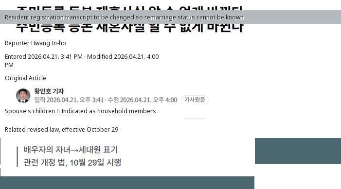 바로 주민등록 등본으로 재혼남녀인지 알 수 없게 되는 것4월 21일 오늘 통과한 따끈따끈한 개정안으로 10월 29일부터 당장 실시하도록 신속하게 처리되었대!앞으로는 민법상 가족은 '세대원'으로,가족 외 동거인은 '동거인'으로만 표기되어 가족관계를 유추할 수 없게끔 방지!개인은 보호하고'다양한가족형태'는 포용해야겠지?그럼 이만!-주민등록 등본 재혼사실 알 수 없게 바뀐다- dc official App출처: 싱글벙글 지구촌 갤러리[원본 보기]