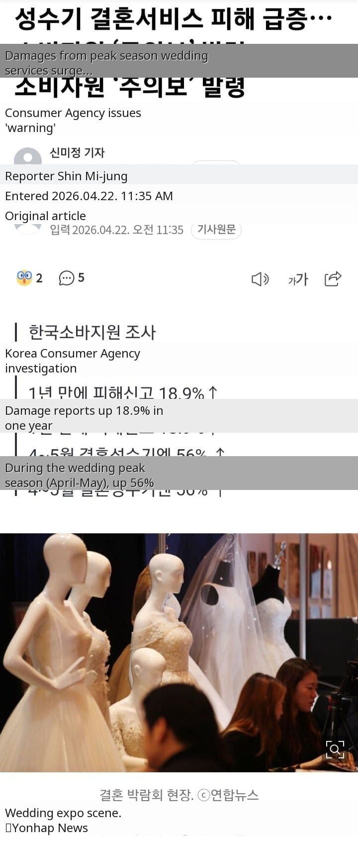 https://n.news.naver.com/article/310/0000135962?ntype=RANKING성수기 결혼서비스 피해 급증… 소비자원 ‘주의보’ 발령한국소비자원이 공정거래위원회, 저출산고령사회위원회와 함께 봄철 결혼 성수기를 맞아 '결혼서비스 소비자 피해예방주의보'를 발령하고 예비부부들의 각별한 주의를 당부했다. 소비자원에 따르면, 결혼서비스 관련 소비자 피해구n.news.naver.com출처: 서기장 갤러리[원본 보기]