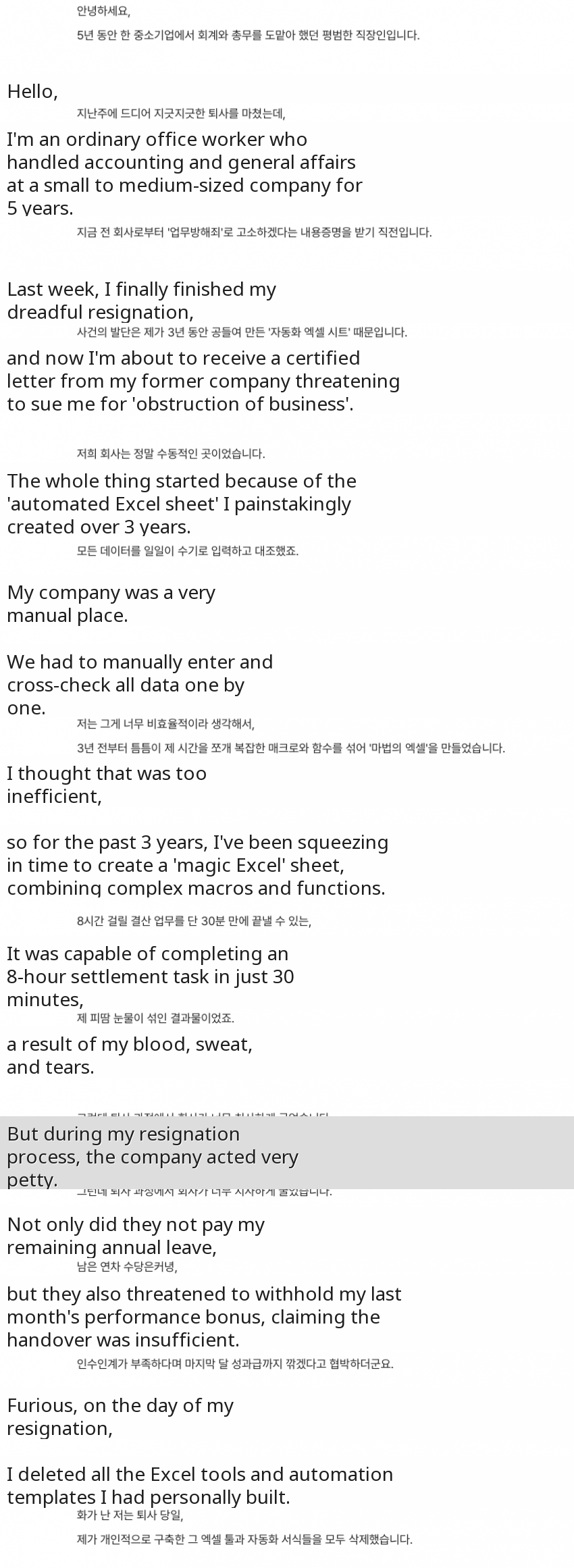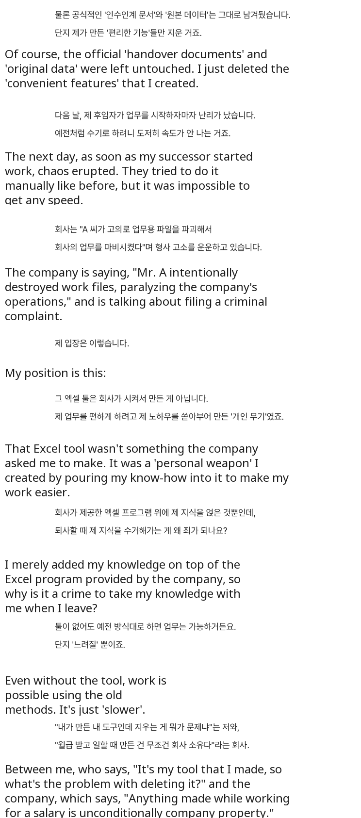 선요약) 회사다니면서 개인적으로 3년동안만든 엑셀 자동화 프로그램으로 일 효율을 획기적으로 높여줬는데회사가 좆같이굴어대서 개빡쳐서 원본데이터는 건들지않고 자기가 만든 프로그램만 지움회사는 일 효율 떨어졌다고 개발자를 업무방해로 고소-퇴사하며 엑셀 매크로 삭제한 직장인+ 결말출처: 싱글벙글 지구촌 갤러리[원본 보기]