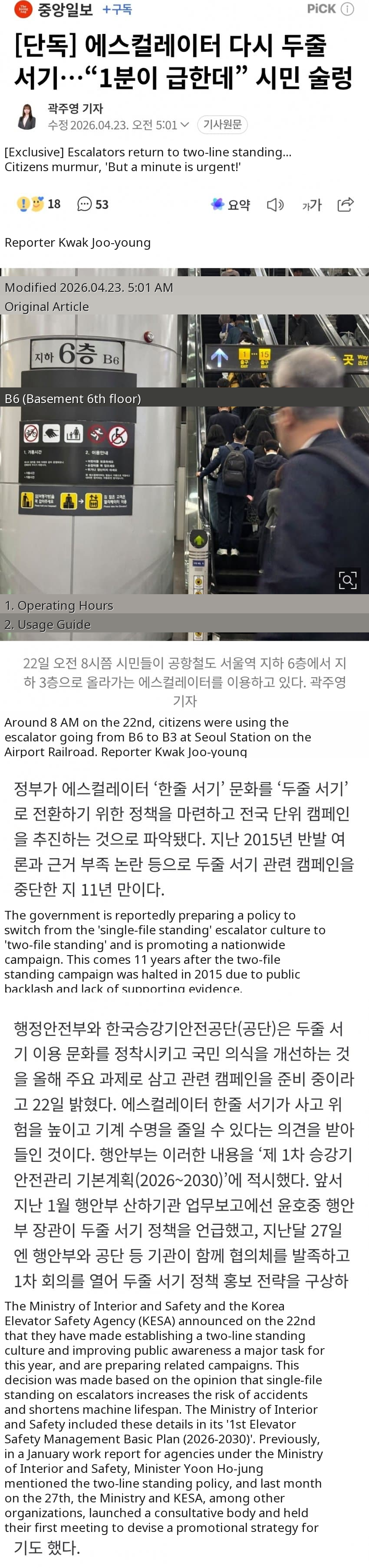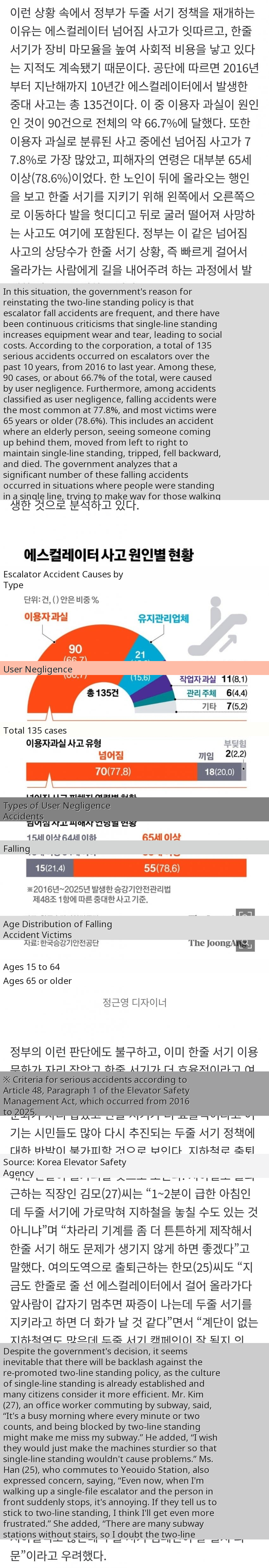 https://n.news.naver.com/mnews/article/025/0003518258[단독] 에스컬레이터 다시 두줄 서기…“1분이 급한데” 시민 술렁정부가 에스컬레이터 ‘한줄 서기’ 문화를 ‘두줄 서기’로 전환하기 위한 정책을 마련하고 전국 단위 캠페인을 추진하는 것으로 파악됐다. 지난 2015년 반발 여론과 근거 부족 논란 등으로 두줄 서기 관련 캠페인을 중단n.news.naver.com- dc official App출처: 더불어민주당 비대위 갤러리[원본 보기]