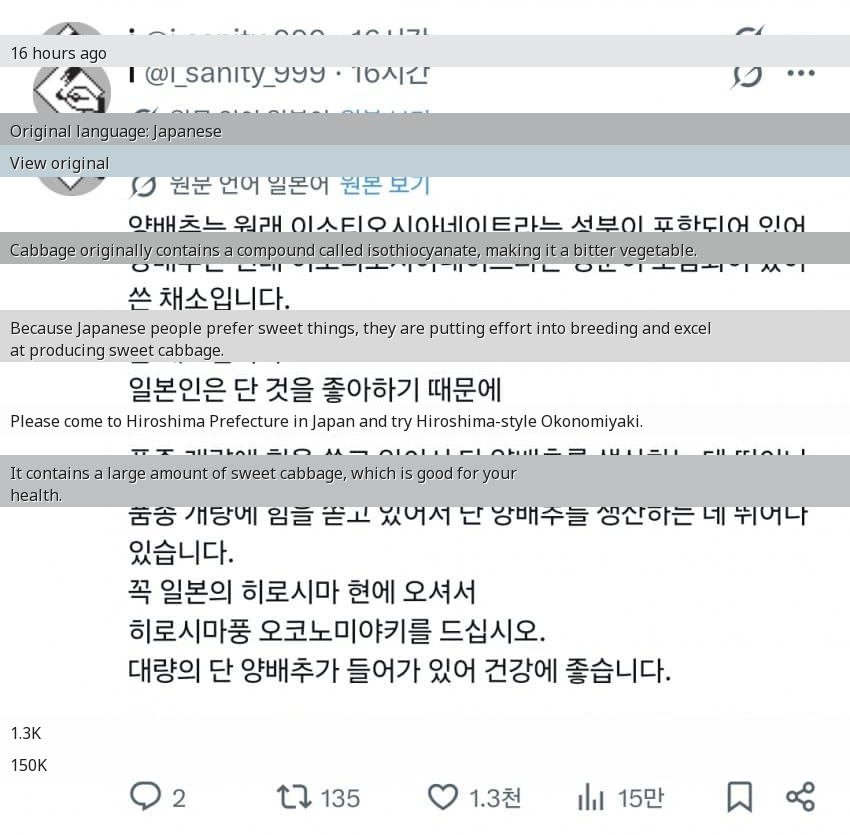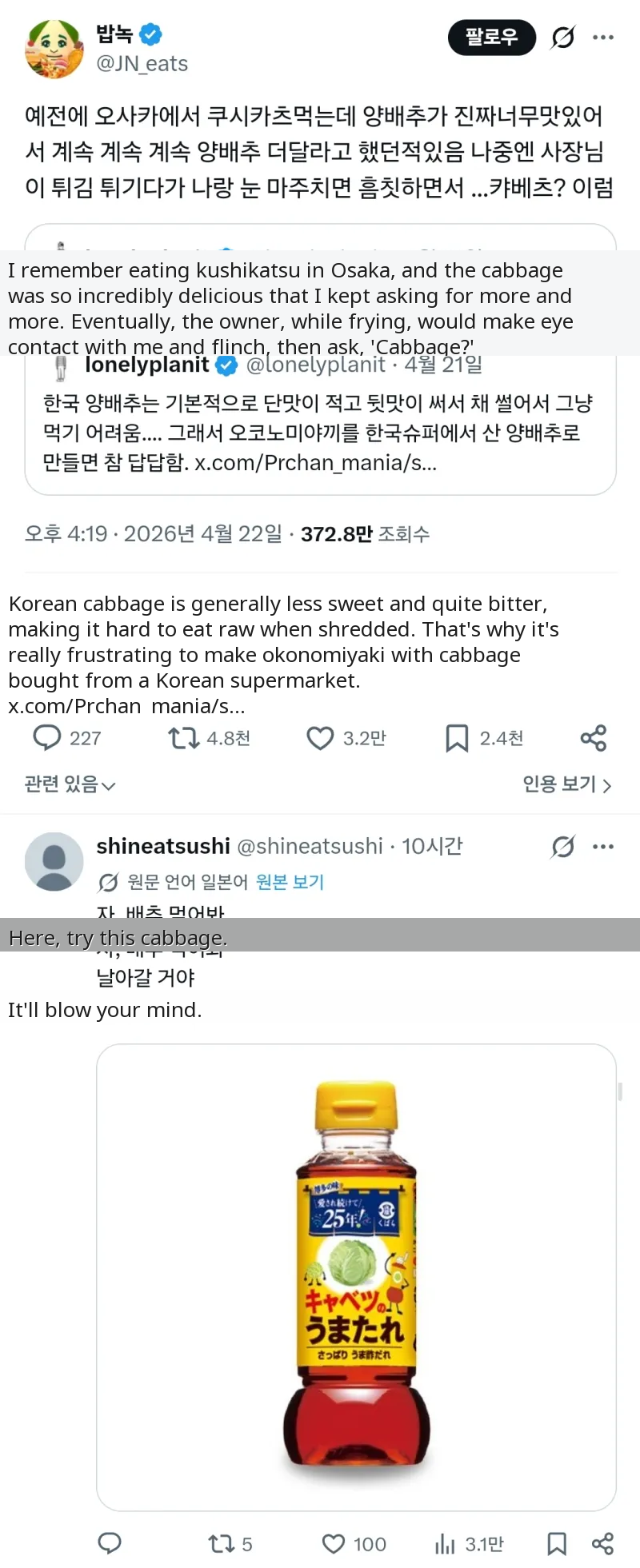 This post went viral because it hilariously captures a common experience for Koreans visiting Japan – the surprising deliciousness of everyday ingredients like cabbage. The owner's deadpan 'Cabbage?' reaction is pure internet gold, sparking relatable discussions about food differences.