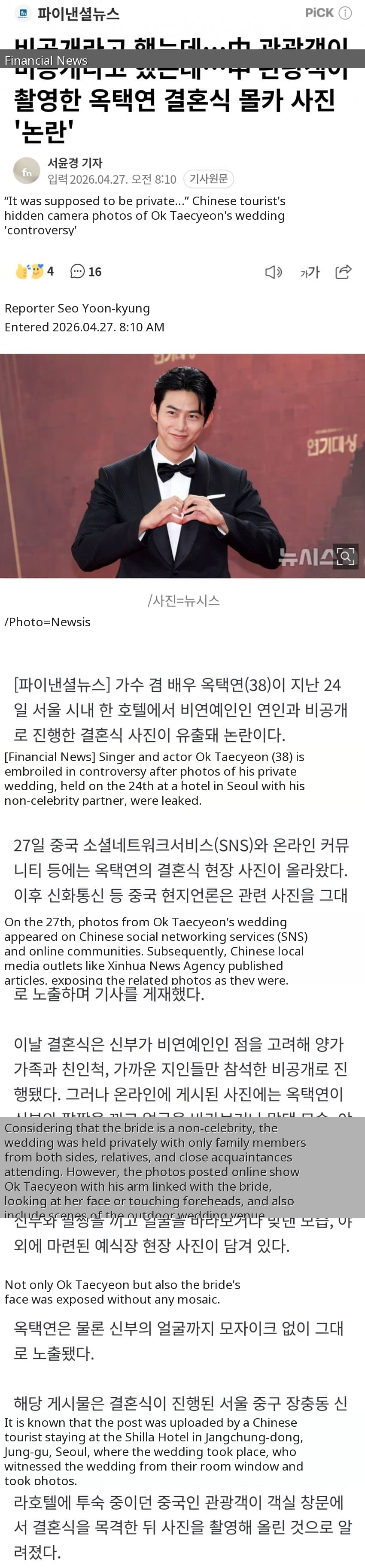https://n.news.naver.com/article/014/0005513471비공개라고 했는데…中 관광객이 촬영한 옥택연 결혼식 몰카 사진 '논란'가수 겸 배우 옥택연(38)이 지난 24일 서울 시내 한 호텔에서 비연예인인 연인과 비공개로 진행한 결혼식 사진이 유출돼 논란이다. 27일 중국 소셜네트워크서비스(SNS)와 온라인 커뮤니티 등에는 옥택연의 결혼식 현n.news.naver.com- dc official App출처: 더불어민주당 비대위 갤러리[원본 보기]