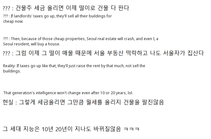 But netizens quickly shut down the fantasy with a dose of harsh reality: 'If taxes go up, landlords won't sell; they'll just hike up the wolse even more.' The post concludes with a sarcastic jab at the perceived naivety of some, suggesting 'that generation's intelligence doesn't change even after 10 or 20 years, lmaooo.' It's a stark reminder of the deep-seated frustration and generational divide over Korea's seemingly intractable housing problem.