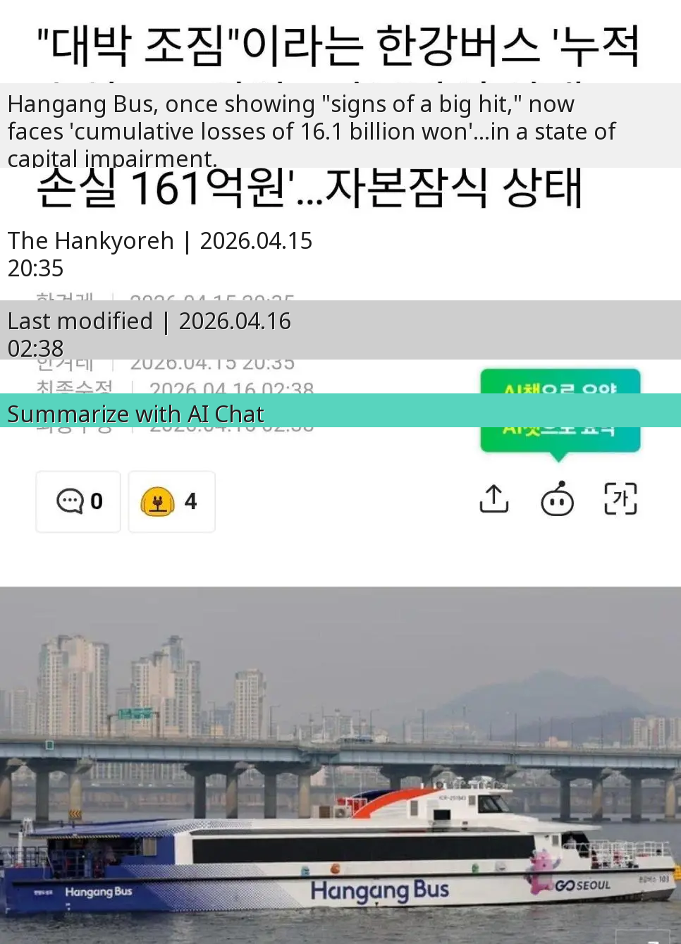 Seoul's ambitious Hangang Bus project, once hyped with "signs of a huge success" (or **daebak jojim** as Koreans would say), is now making headlines for all the wrong reasons. A recent report reveals the project has racked up a staggering 16.1 billion KRW (approx. $11.7 million USD) in cumulative losses, putting it in a state of capital erosion. This financial disaster has ignited a firestorm of criticism online, with many questioning how such an unviable project ever got approved in the first place. Commuters often prefer alternatives like running or using **Ttareungi**, Seoul's popular public bike-sharing system, making the bus's utility questionable. The public is furious, seeing this as another example of taxpayer money being squandered on poorly planned government initiatives.