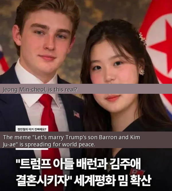 This meme is going viral in Korea due to its sheer absurdity, combining two politically prominent figures from opposing nations in a humorous 'arranged marriage' scenario for world peace. The heavy photoshopping of Kim Ju-ae's image also adds to the comedic effect and sparks discussion.