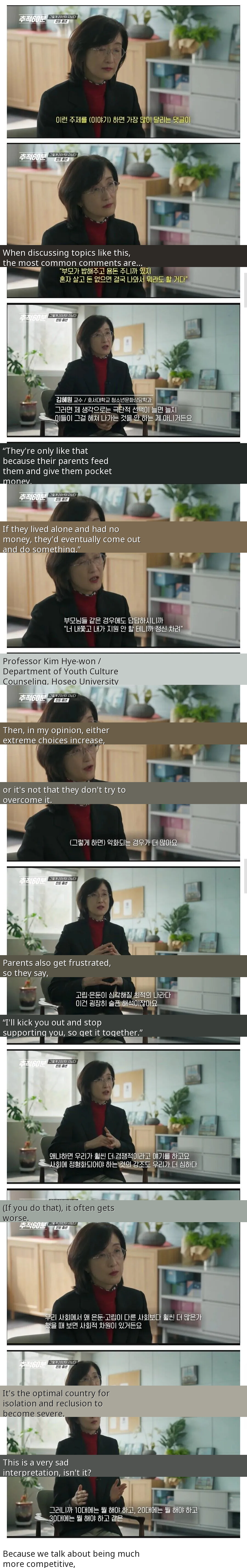 This topic is trending because it touches on a sensitive and growing social issue in Korea: the increasing number of young adults struggling to find employment and become independent. The professor's direct counter-argument to a common 'tough love' sentiment has sparked a fierce debate about societal responsibility versus individual accountability.