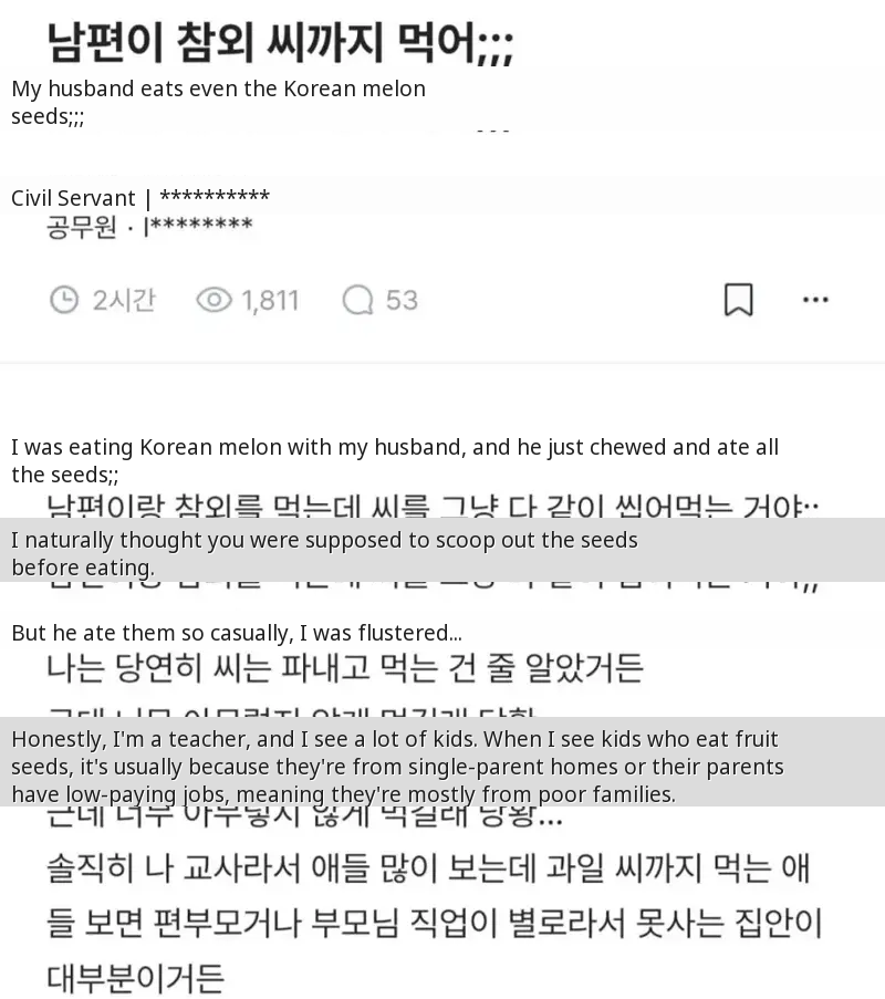 This post went viral because it touches on a common, yet often unspoken, social hierarchy in Korea tied to seemingly trivial daily habits. The poster's candid (and arguably snobby) revelation about judging people based on how they eat fruit seeds sparked both outrage and relatable discussions about hidden 'class' markers in relationships.
