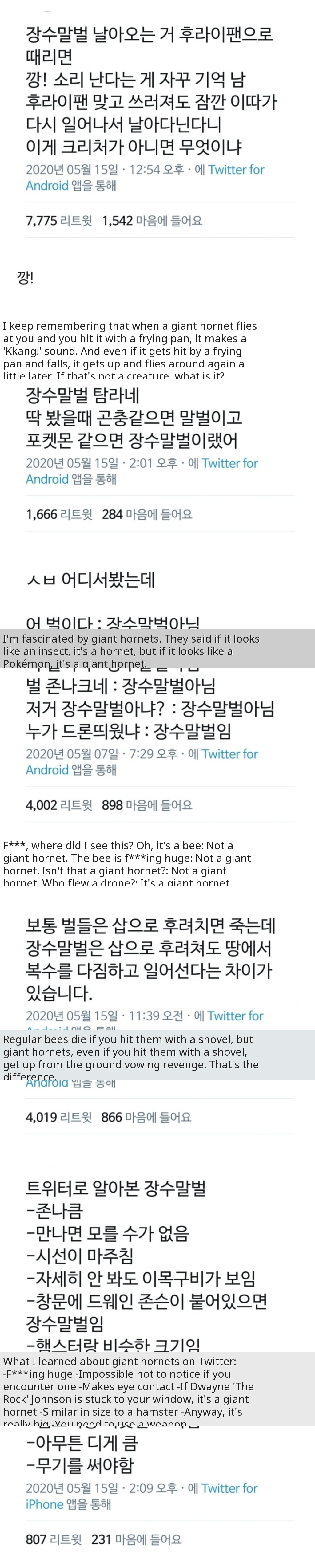 Posts about the terrifying size and resilience of Jangsu Malbeol (Asian Giant Hornets) frequently go viral in Korea because they tap into a shared, exaggerated dread, often turning fear into relatable, dark humor.