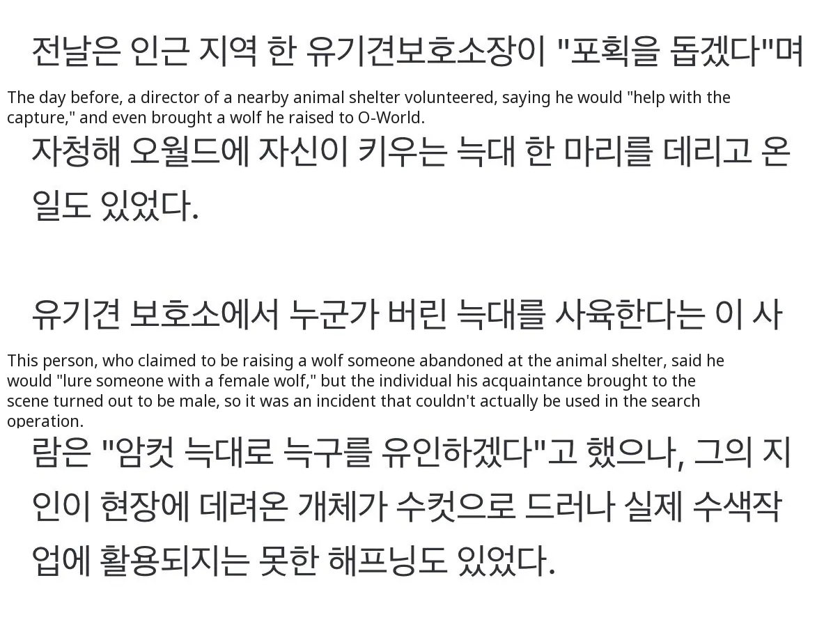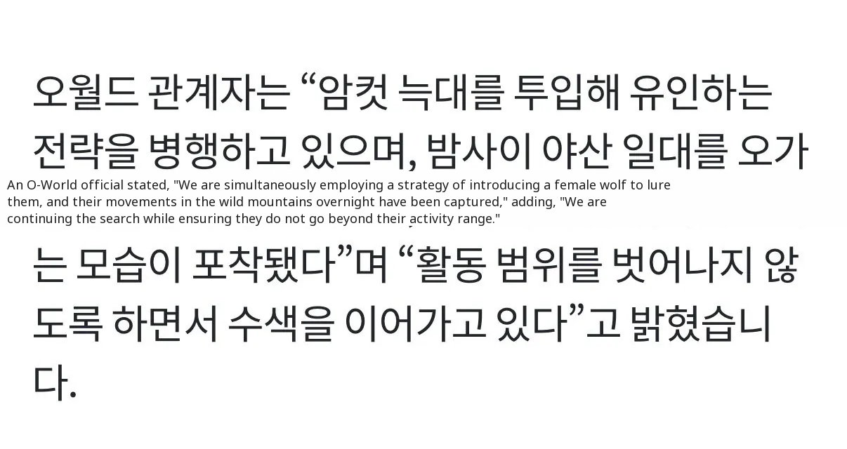 Okay so remember Neuk-gu, the wolf that escaped from O-World in Daejeon? Wild stuff, right? Well, the zoo had this whole elaborate plan to lure him back โ they were gonna use a female wolf as a '๋ฏธ์ธ๊ณ' (mi-in-gye), basically a 'honey trap,' thinking he'd just follow his ~instincts~. But then the news dropped, and y'all, turns out our boy Neuk-gu is actually a dude! The internet is now calling for 'Wolf-mom' (๋์) to appear and bring him home. Like, they were trying to set him up with a girlfriend, but he's probably out there looking for his boyfriend. The way I'm screaming at this whole situation, this is literally so chaotic ๐.