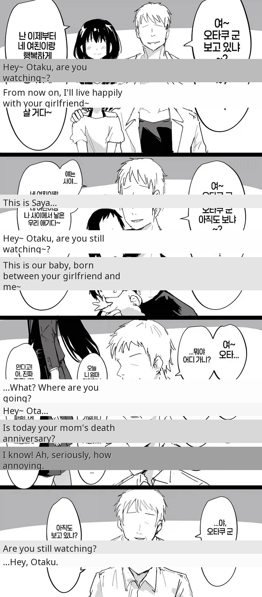 Okay, so this post is sending me fr fr. It starts off like your typical 'Geumtaeyang steals the main character's girl' trope, right? This dude is out here flexing, all like, 'Yo Otaku-kun, I'm living happily ever after with your girlfriend now~' And then he drops the bomb, 'This is Saya, our baby, born between me and your girlfriend~' Like, bro, chill! He keeps taunting, 'Still watching, Otaku-kun?' And Otaku-kun is just like, 'I know! Ugh, seriously, so annoying.' But then the whole thing takes a hard left turn into a brick wall. Geumtaeyang casually drops, 'Today is your mom's death anniversary.' WAIT WHAT?! The 'girlfriend' was Otaku-kun's MOM all along?! My jaw is on the floor. Geumtaeyang is confused when Otaku-kun starts to leave, still trying to taunt him. But Otaku-kun just turns around and says, 'I was watching, always. So don't worry about me.' Bro, the way I'm crying right now. Geumtaeyang wasn't stealing a girlfriend; he was becoming a stepfather and taking care of Otaku-kun's mom. This is pure love, but make it chaotic internet drama. I'm dead ๐