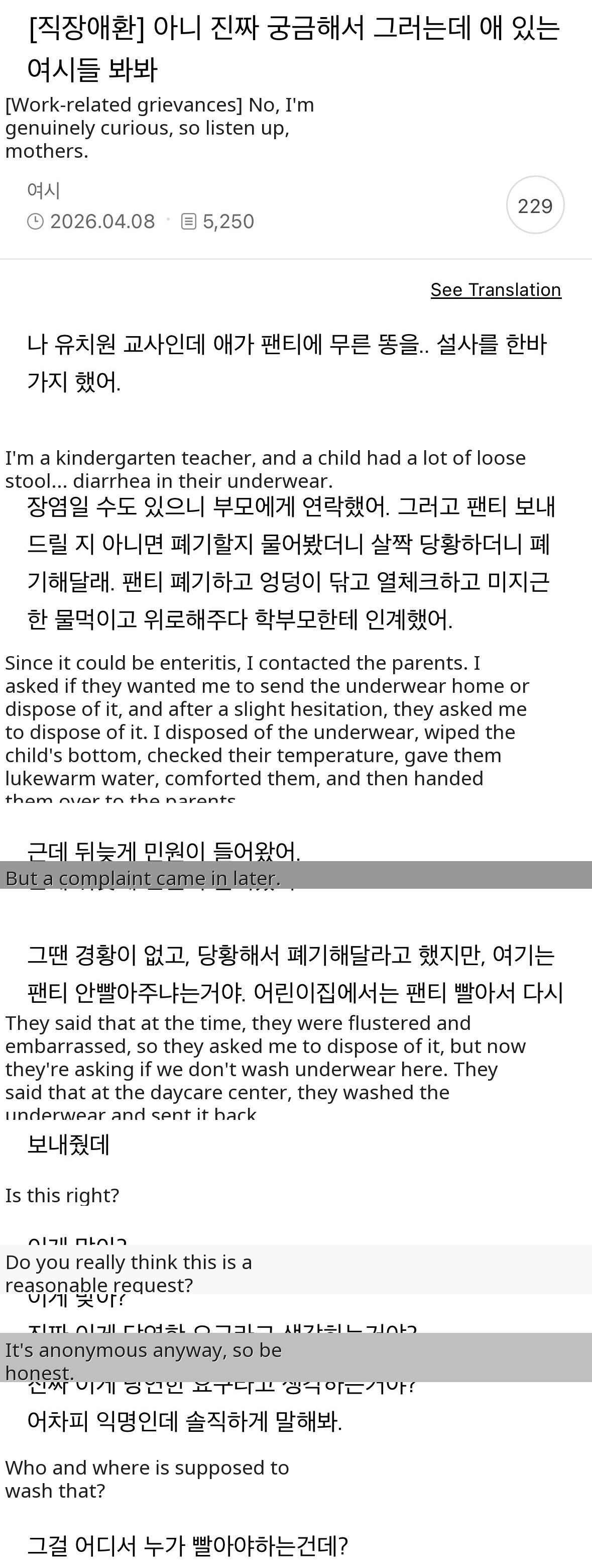 A recent post by a kindergarten teacher has sparked a heated debate online, highlighting the often-unspoken expectations placed on childcare providers in Korea. The teacher shared a story about a child who had a severe case of diarrhea in their underwear. After contacting the parent, the teacher was initially told to discard the soiled underwear, which she did after cleaning the child and ensuring their comfort. However, a complaint was later filed by the same parent, who argued that other daycare centers (어린이집, *eorinijip*) would wash and return such items. The teacher is now asking netizens if this is a reasonable expectation, questioning who exactly should be responsible for washing a child's soiled underwear in such a situation.