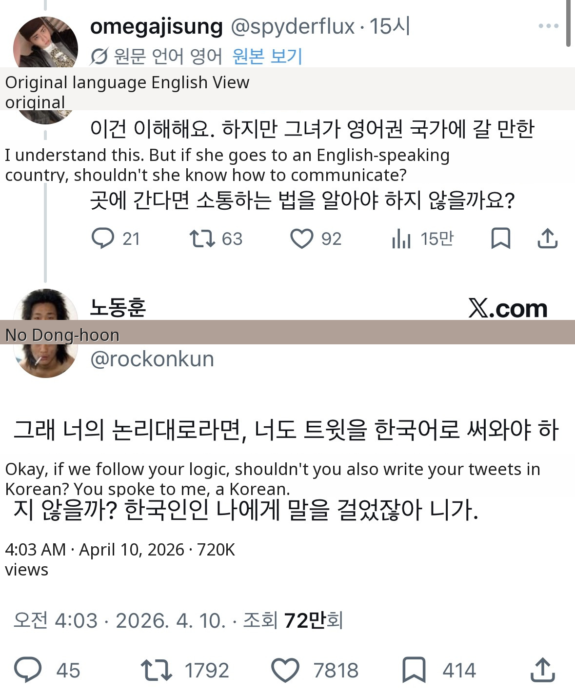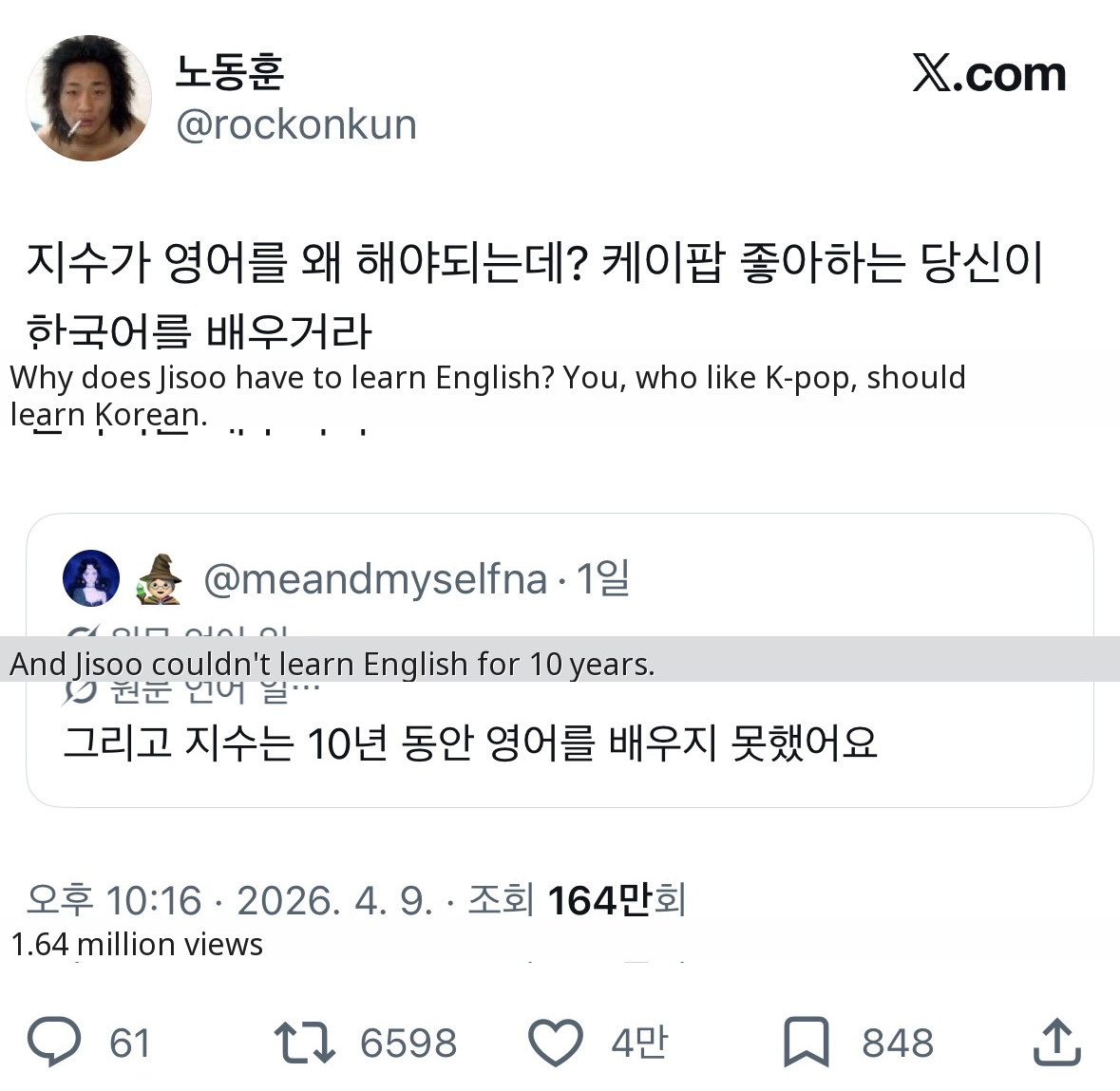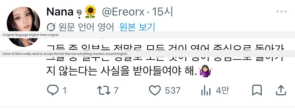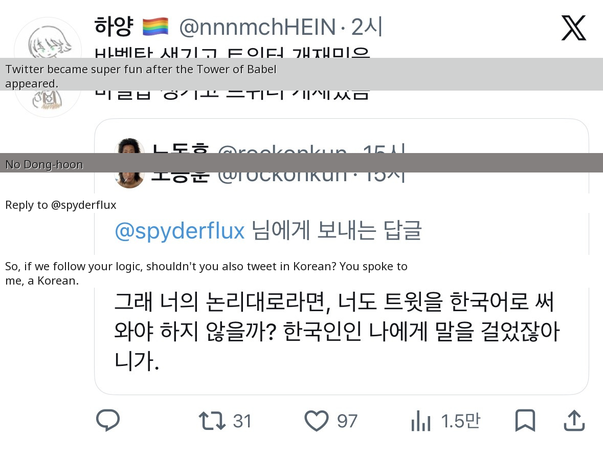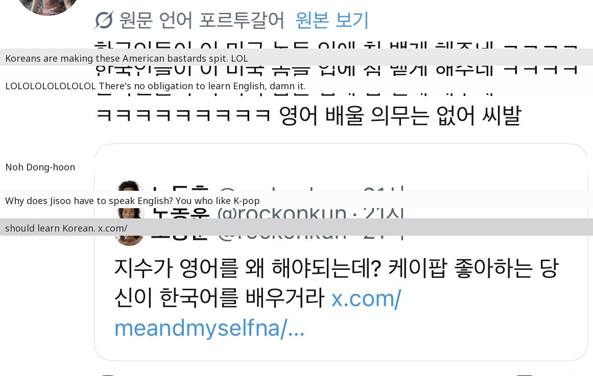Okay, so Twitter just dropped this wild update where tweets in other languages auto-translate to your native tongue, no cap. What does that mean? Keyboard warrior mode just got activated worldwide, fr fr. So, naturally, some Korean stan went absolutely feral clapping back at an *oegwi* (foreign anti-fan) who was trashing a K-pop *yeodol* (girl group) in English. And y'all, that tweet went so viral among international fans, it's insane. Then the Korean stan dropped some more iconic nonsense, and foreign fans were literally screaming, loving it even more γ γ γ γ γ γ γ . The fact that the Korean text was instantly translated without needing a separate app just made the whole thing hit different. This is lowkey the 21st-century Tower of Babel, and I'm here for the chaos.
