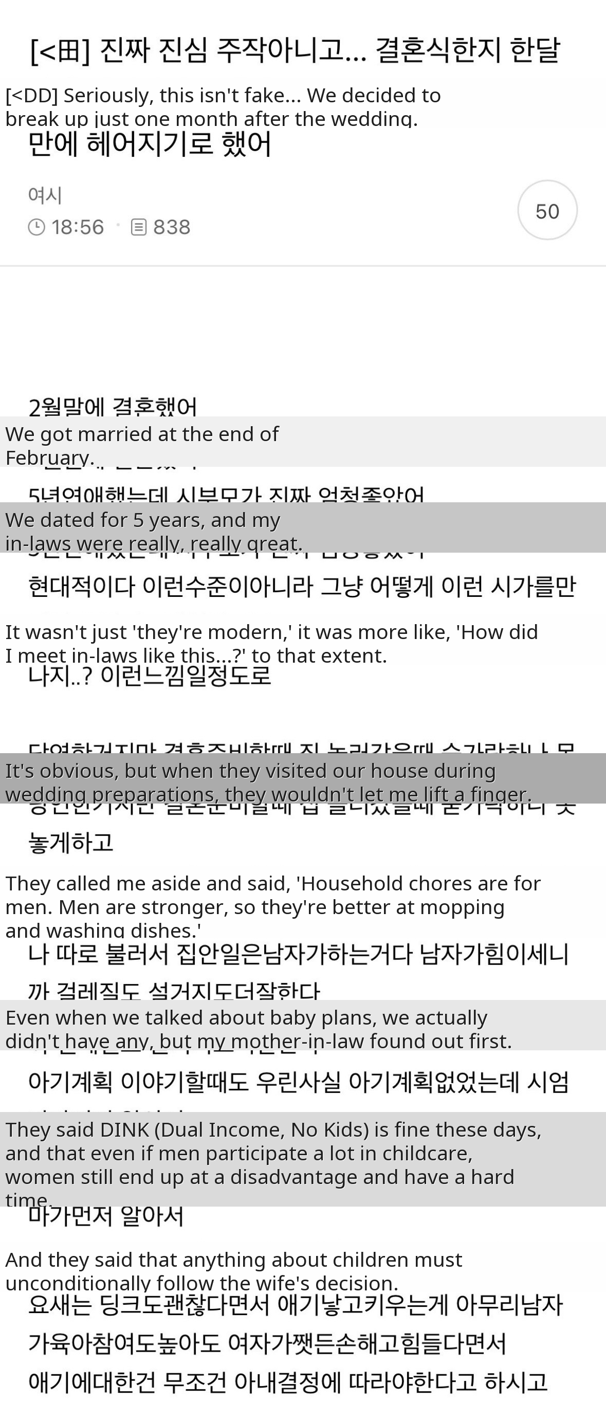 The dramatic and sudden change in the in-laws' behavior, combined with the quick decision to end the marriage, is highly relatable and shocking to many Koreans who understand the pressures of family expectations.