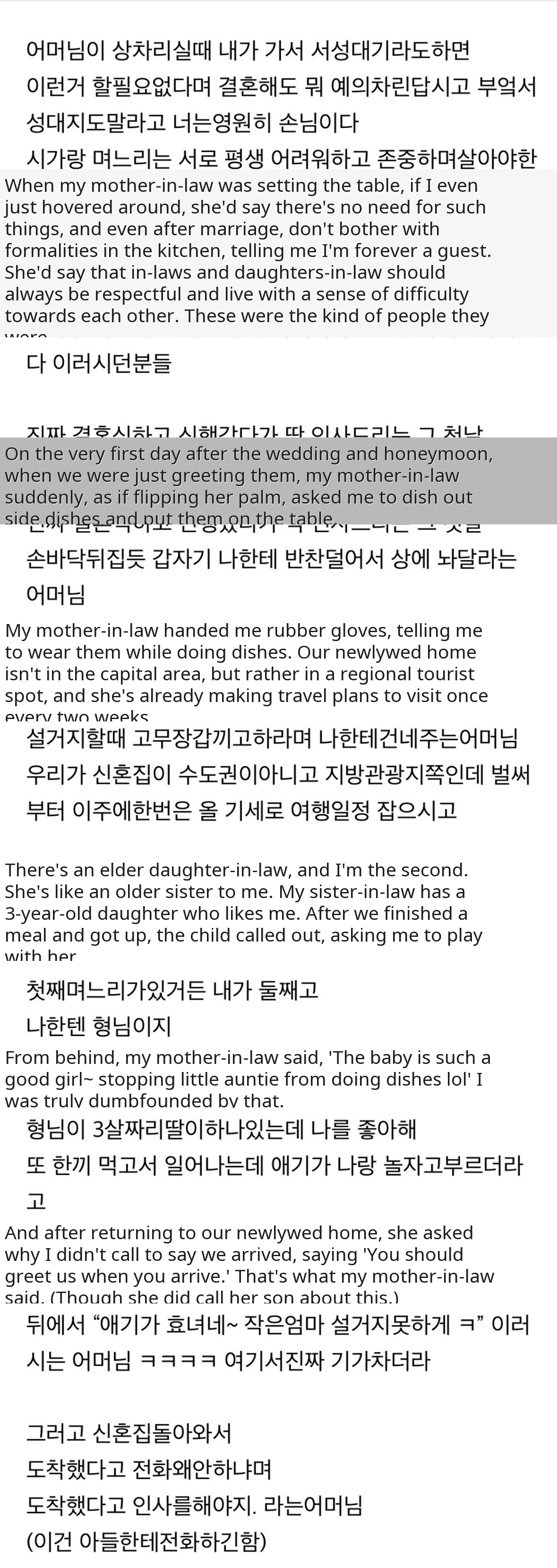 In traditional Korean culture, the relationship between a daughter-in-law and her husband's family (especially the mother-in-law) can be complex and often involves significant expectations regarding household duties and respect. While modern families are changing, the 'ideal' daughter-in-law often still faces pressure to conform to traditional roles.