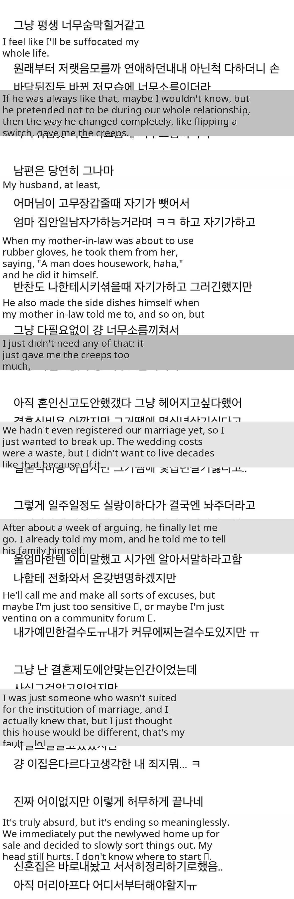 Despite her husband's attempts to intervene and take over chores, the poster was too creeped out by the sudden, drastic change in her in-laws' behavior. Realizing she couldn't endure decades of such pretense, and crucially, having not yet completed the official marriage registration (혼인신고), she decided to end the marriage. After a week of difficult conversations, her husband agreed to the separation. The poster has already informed her own mother and is now navigating the painful process of selling their newlywed home, reflecting on her initial belief that this family would be different.