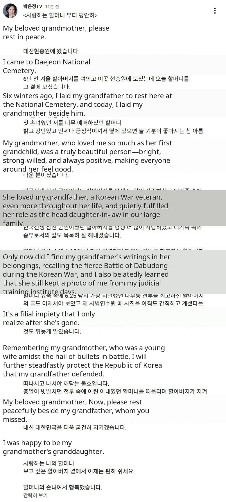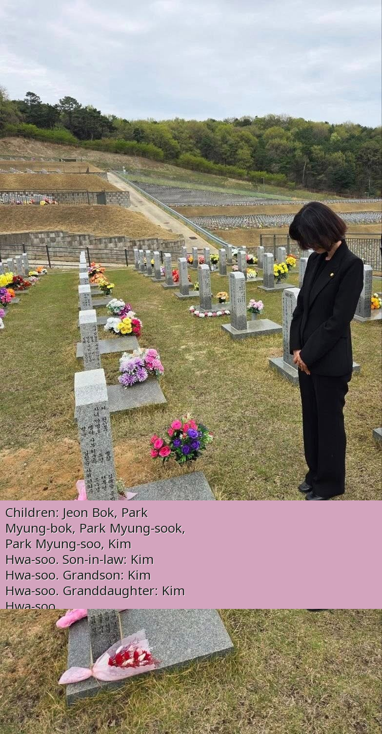 Reflecting on her grandfather's sacrifice, who protected the nation while bullets rained down, thinking of his young wife, Park Eun-jung vowed to continue safeguarding the Republic of Korea. She concluded her touching tribute by wishing her grandmother eternal peace beside her beloved grandfather, expressing her happiness and pride in being her granddaughter.