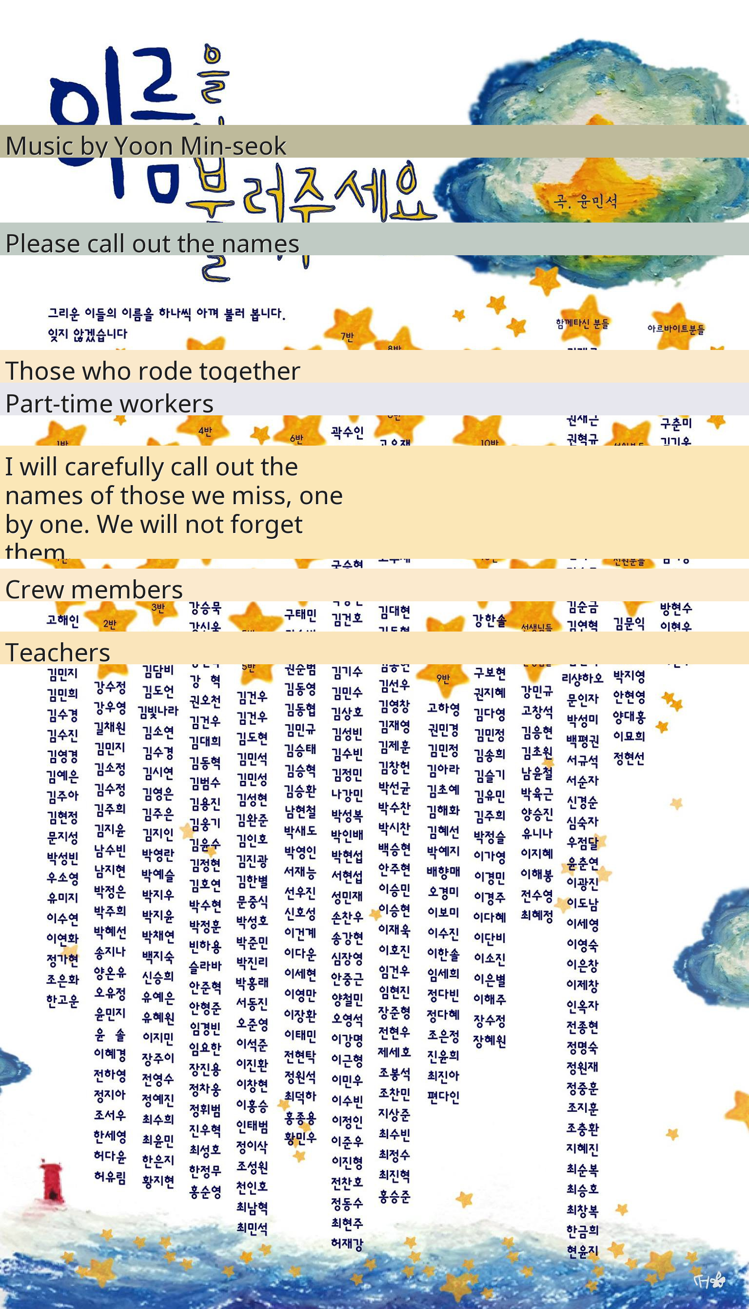 Composer Yoon Min-seok shared the story behind the song's creation, revealing that he initially considered having many people sing it. However, he ultimately decided that one person, like a *pansori* singer performing an entire epic, should deliver the names from start to finish. This profound task was taken on by Jang Han-na, a young woman who, as a high school student at the time, spent over a year standing in solidarity with the bereaved families at Gwanghwamun Square, enduring all weather conditions. She was just a year or two older than many of the student victims, making her voice particularly resonant.