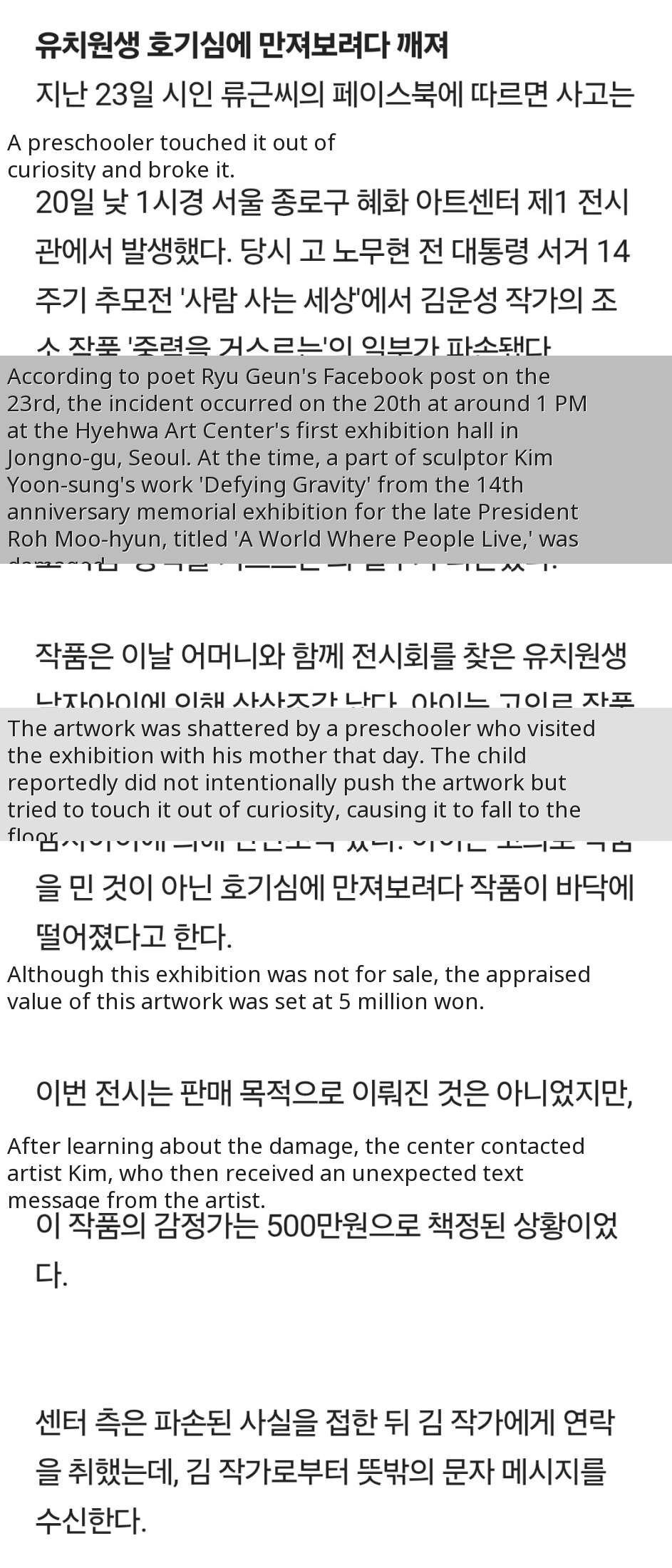This story went viral in Korea because of the artist's incredibly compassionate and understanding response to the accidental destruction of his valuable artwork. It's a heartwarming contrast to typical expectations of blame or compensation, sparking admiration and discussion online.