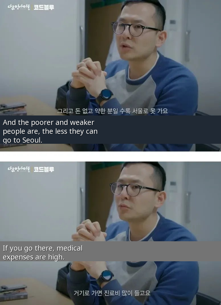 I live in a small town, and on Saturdays, all the early morning bus seats to Seoul are booked. You might think it's for people going to play, but more than half are seniors heading to Seoul for medical treatment. Even with the travel costs, they want the best doctors and tech, thanks to national healthcare making treatment relatively affordable. I wonder how grateful these seniors are to doctors like the one in this post... Local doctors are decreasing not just because doctors prefer big cities, but maybe also because they feel local residents view them as inferior to Seoul doctors.